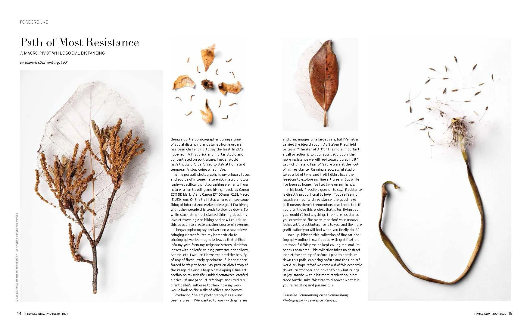 A Shift to Macro Photography While Social Distancing was published in Professional Photographer magazine in July 2020.